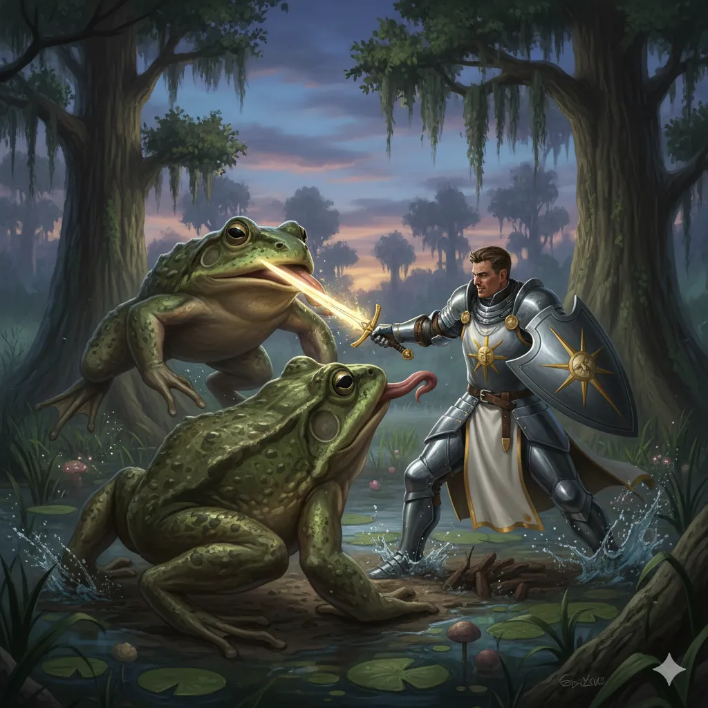“Sylvanus, grant me—” Bancroft’s prayer died on his lips, the divine words scattering like startled birds. Beside him, Seacrock’s attempted cantrip fizzled into nothing. The frogs’ bulging eyes fixed on the dog with primal hunger.